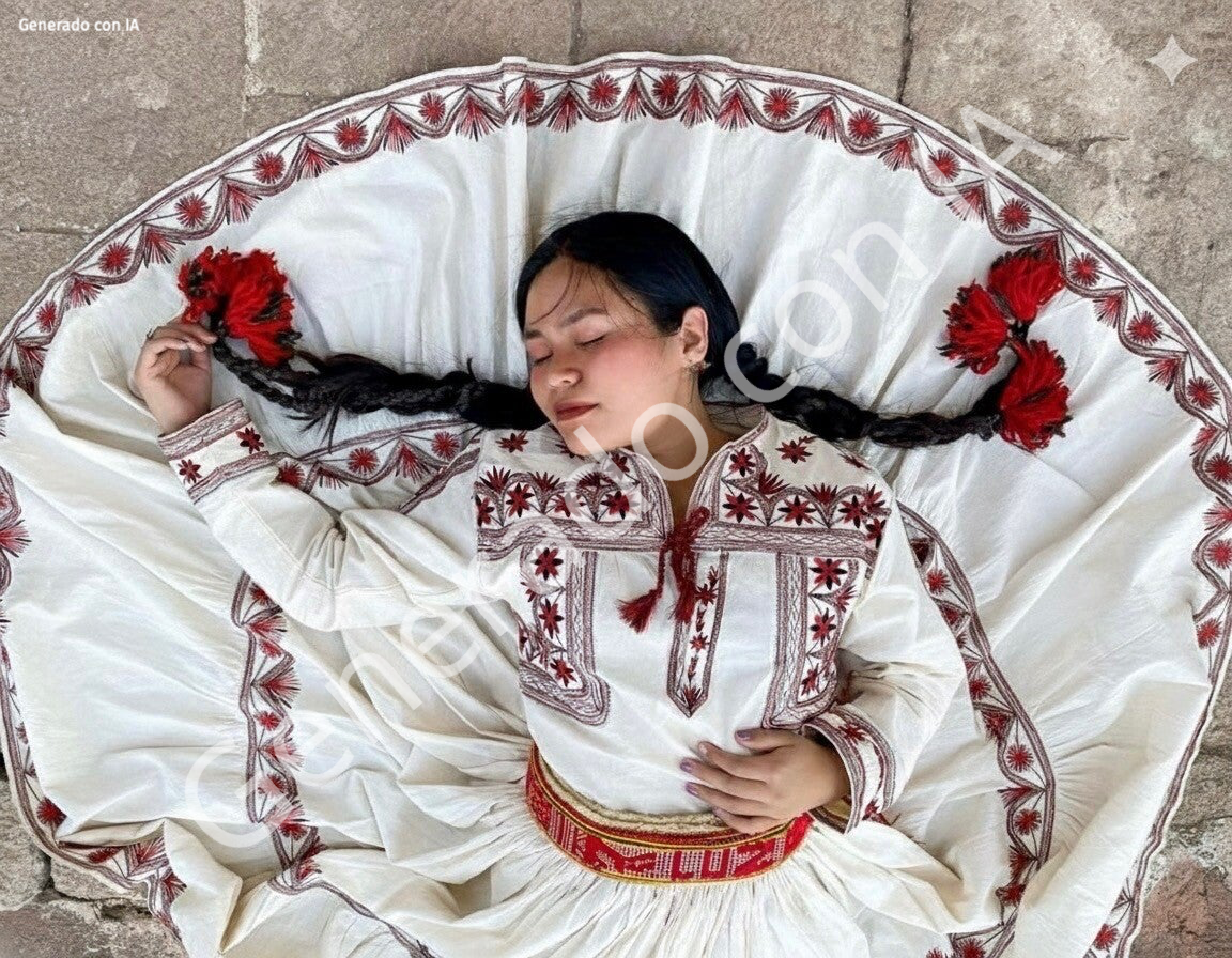 Motivos: En los bordados se plasman las montañas, las veredas, el sol, las flores. Estos motivos no solo embellecen el traje, sino que también cuentan historias sobre la cosmovisión mixe y su relación con el entorno.